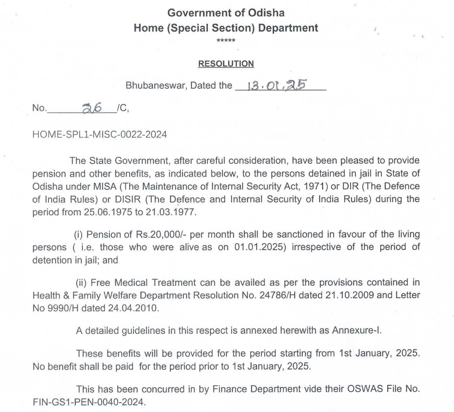 The Odisha government also issued a press release regarding this, in which it is said that a person who was in jail during the emergency situation between 15 June 1975 and 21 March 1977 under the 1971 Act or DIR (Defense of India Rules) or DISIR (Defense and Internal Security of India Rules) will get the benefit of this special facility.